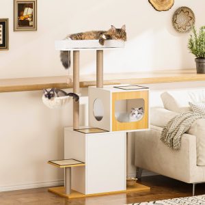 Tavion Wooden Modern Cat Tree Tower with 2-Floor Condo, Capsule Nest and Dangling Balls, for Indoor Cats