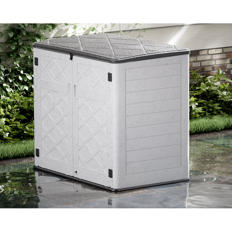 Ideal for storing trash cans, lawn and garden products, snow blowers, bicycles, and more, this stylish storage solution is a must-have in every season. Additional features include durable multi-wall resin construction for year-round strength and stability, laminate flooring to accommodate heavier items, a 3-door locking system for added security, and a sleek, low-profile design that fits neatly in many spaces.