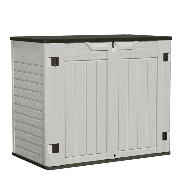This storage shed is made from weatherproof resin for UV protection, all-weather use, easy cleaning and maintenance; Alluring wooden texture will not fade and the innovative lid design keeps water out.