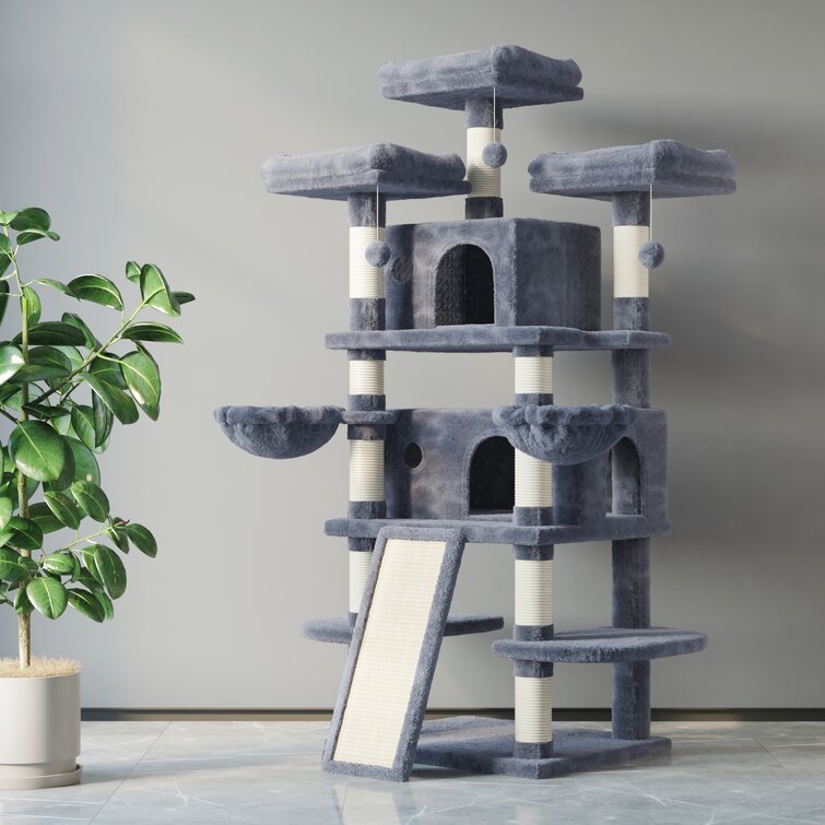 Your cat will love this multiple-level cat tree. It’s designed for cats to play happily. This cat tree combines the benefits of an outdoor tree with the safety of indoor cat furniture. Without going outside, your cat can enjoy the same fun of playing and relaxing on the tree! The cat activity tree is made of highly durable particle wood, wrapped with 400g soft plush to keep your cats warm and cozy; multiple scratching posts covered by natural sisal ropes are perfect for your cats to scratch, climb, play, and become active. Safety precautions are anchored into the wall to prevent tipping over and the strengthened base ensures stability and safety. Easy to assemble with included tools and instructions.