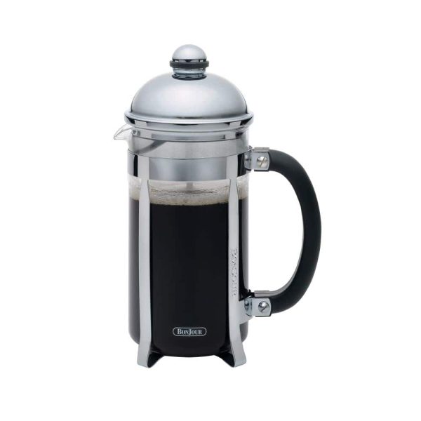 Beauty meets innovation in this classically designed BonJour Coffee 8-Cup Maximus French Press. Crafted from heat-resistant borosilicate glass, this French press features an easy-pour spout, and boasts a brushed stainless steel frame and gleaming stainless steel domed lid. The patented Flavor Lock filter system integrated right into the stainless steel plunger allows the brewing process to be stopped in the French coffee press when the desired strength is reached. A convenient filtering lid feature helps reduce sediment in cups of espresso and gourmet coffee beverages such as cappuccinos and lattes. Designed with a comfortable handle, the coffee press also comes with a convenient acrylic measuring scoop for adding coffee and espresso. Top-rack dishwasher safe, handwashing the carafe is recommended to preserve its finish.