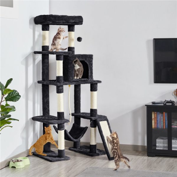 • The large cat tower has multiple levels for cats to play and sleep, including a top perch with a danging ball, a condo, a hammock, a hanging rope, a scratching board, seven scratching posts, and some extended platform space.