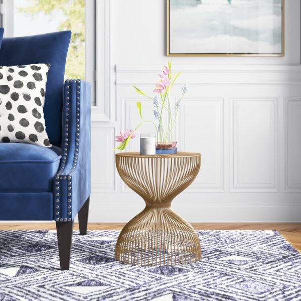 This end table has a sleek silhouette that is sure to add plenty of industrial glam to your living room. It showcases an hourglass silhouette that’s made from a collection of iron wires in your choice of contemporary metallic finish. A small flat circle in the middle of the tabletop gives you a flat surface for your cup of coffee or potted plant. It measures 17.75″ tall, so it has a shorter silhouette than a standard side table, making it ideal next to low-profile sofas.