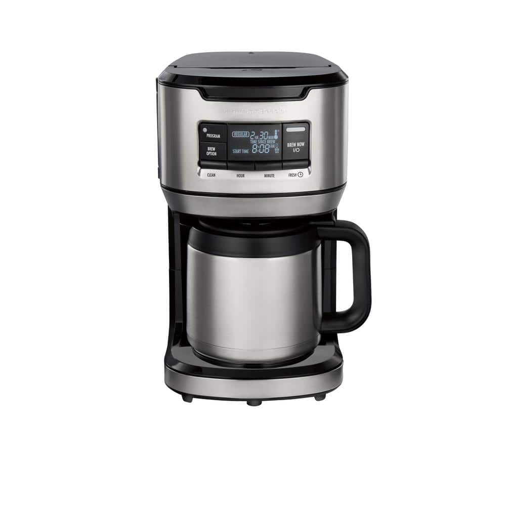 If you want your coffee to stay hot and fresh-tasting for a long time, a coffee maker with a thermal carafe is your best choice. Not only does it offer extra-large capacity, the Hamilton Beach Programmable Front-Fill 12 Cup Coffee Maker with Thermal Carafe keeps coffee hot for up to 4 hours in its vacuum-sealed thermal carafe. The convenient front-fill design makes it easy to add fresh ground coffee and water. Then right before you brew, quickly rinse the thermal carafe with hot water. This hot-water-rinsing step doesn’t take long, but it makes a big difference, since it warms up the stainless steel to help it hold coffee’s hot temperature longer. And because the thermal carafe is insulating your hot coffee without the need for a heating plate, there’s no fear of coffee losing its fresh, just-brewed flavor. A freshness timer shows you how long since your coffee brewed. This coffee maker comes with a gold-tone reusable filter so you don’t have to purchase paper filters. Set coffee to brew ahead with a programmable timer. And choose from 3 brewing options: bold, regular and 1-4 cups. An auto shutoff feature turns the coffee maker off after brewing stops.