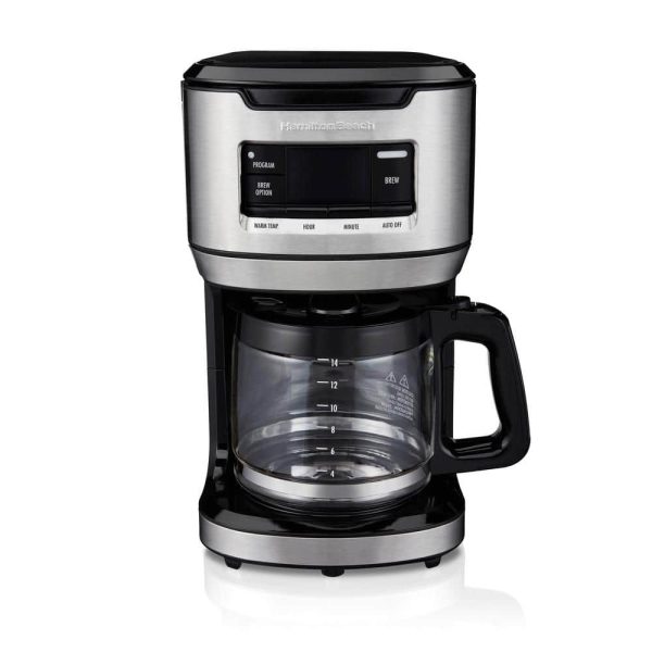 The Hamilton Beach 14-Cup Programmable Coffee Maker featuring front-fill design. Brew basket and water reservoir are easy to access for quick, convenient filling. Reusable cone filter with handle makes it easy to dispose of messy grounds and maximizes coffee flavor, while the included water filter removes impurities. Drip-free carafe is specially designed for easy pouring and to eliminate spills, even when the pot is full. Programming options allow you to set wake-up ready coffee while choosing from 3 brewing options: regular, bold and 14 cups. Adjustable keep-warm function and 2-hour auto shutoff keep coffee hot and your kitchen safe.