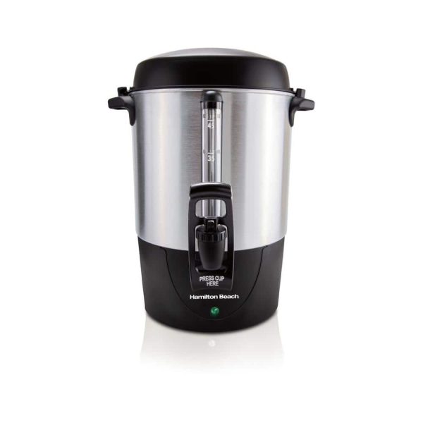 The Hamilton Beach Fast Brew Coffee Urn brews coffee 30% faster, reducing wait-time for your guests. The urn makes 15-45 cups of coffee, and brews 45-cups in just 28-minutes. The urn features dual heaters to keep coffee hot without overheating. The ready light illuminates to let you know when the coffee’s ready to serve. The urn is also great to use for hot tea and other drinks. Coffee is easy to pour from the urn using the easy-press lever, which is activated at the push of a cup making it easy to pour coffee using just one hand. The urn easily dispenses coffee into any kind of cup, even disposable cups. Clear water level markings in the urn’s water/coffee level window make it easy to see how much water you’re adding or how much coffee is left in the urn. The removable coffee filter basket lifts from the urn and is easy to clean in the dishwasher. No paper filters are needed. The brushed finish looks great with every decor and resists fingerprints. The handles stay cool to the touch for comfort, and the lid on the large coffee maker locks in place to eliminate spills.