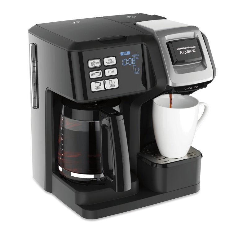 - Three ways to brew. Brew 12 cups with ground coffee on the carafe side or brew a single serving with a pod or ground coffee on the other. With a pod, you can brew up to 10 oz. Of coffee and when you use coffee grounds, you can fill a 14 oz. Travel mug.