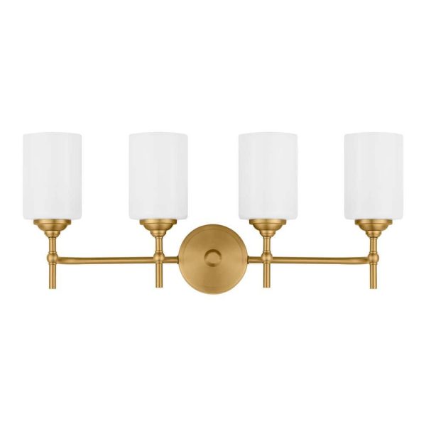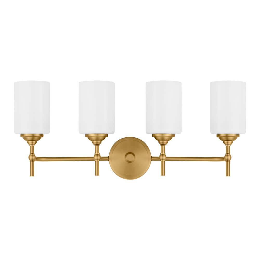 Enhance your home interior with this Home Decorators Collection Ayelen 4-light vanity light. Great for your hallway or bathroom, the opal white glass shades and matte brass finish create decorative charm. This modern fixture comes with all mounting hardware for a convenient installation, and you can install the shades up or down. Metal construction ensures lasting use.