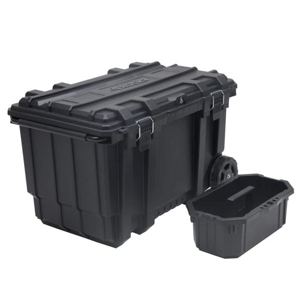 This Husky Rolling Toolbox is heavy-duty for transporting power tools, parts, work gear and more at your home or job site. Its deep storage with tray included, handily holds 50 gallons with the weight capacity of 100 lbs. And to secure your tools, this lockable toolbox comes with keys included. Extra security is available with integrated padlock slots. The rugged 7.23 in. diameter rubber wheels and padded, telescoping steel handle makes it easily portable. A gasket in the hinged toolbox lid provides extra protection from severe weather and dust for long lasting use. The versatile lid has other practical key features. For added convenience, the Husky Rolling Toolbox offers electrical power cord access, so that you can charge tools without taking them out of the toolbox. This toolbox has a limited lifetime warranty. Whether in the basement, garage or at the job site, the Husky Rolling Toolbox is convenient and easy to have close at hand.