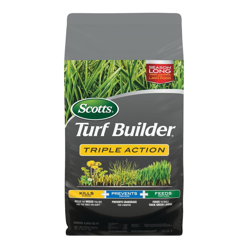 - Scotts Turf Builder Triple Action is a 3-in-1 formula that kills listed weeds, prevents crabgrass, and feeds to build thick, green lawns