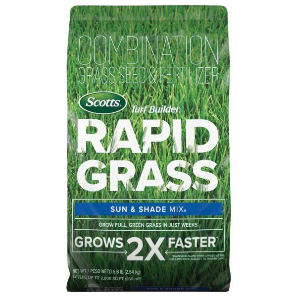 Get outside and enjoy your lawn with Scotts Turf Builder Rapid Grass Sun & Shade Mix. With our revolutionary mix of grass seed and fertilizer in one effective formula, your lawn benefits from extended feeding, resulting in full, green grass. Compared to seed alone, your lawn will grow 2X faster (when applied at the new lawn rate, subject to proper care). Scotts Turf Builder Rapid Grass Sun & Shade Mix grows green, lush grass in just weeks. Use on either new lawns or overseeding existing grass. For best results, apply in the spring or fall when air temperatures are consistently between 60°F and 80°F. We recommend using a Scotts spreader to apply this product (please refer to spreader settings on product label). Do not use weed control products until your lawn has been mowed at least 4 times. Finally, be sure to apply Scotts Lawn Food products every 8 weeks throughout the season to help maintain your thick, green lawn. One 5.6 lb. bag of Scotts Turf Builder Rapid Grass Sun & Shade Mix has a new lawn coverage of 839 sq. ft. and an overseeding coverage of 2,800 sq. ft.