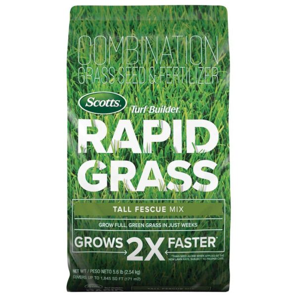 Get outside and enjoy your lawn with Scotts Turf Builder Rapid Grass Tall Fescue Mix. With our revolutionary mix of grass seed and fertilizer in one effective formula, your lawn benefits from extended feeding, resulting in full, green grass. Compared to seed alone, your lawn will grow 2X faster (when applied at the new lawn rate, subject to proper care). Scotts Turf Builder Rapid Grass Tall Fescue Mix grows green, lush grass in just weeks. Use on either new lawns or overseeding existing grass. For best results, apply in the spring or fall when air temperatures are consistently between 60°F and 80°F. We recommend using a Scotts spreader to apply this product (please refer to spreader settings on product label). Do not use weed control products until your lawn has been mowed at least 4 times. Finally, be sure to apply Scotts Lawn Food products every 8 weeks throughout the season to help maintain your thick, green lawn. One 5.6 lb. bag of Scotts Turf Builder Rapid Grass Tall Fescue Mix has a new lawn coverage of 615 sq. ft. and an overseeding coverage of 1,845 sq. ft.