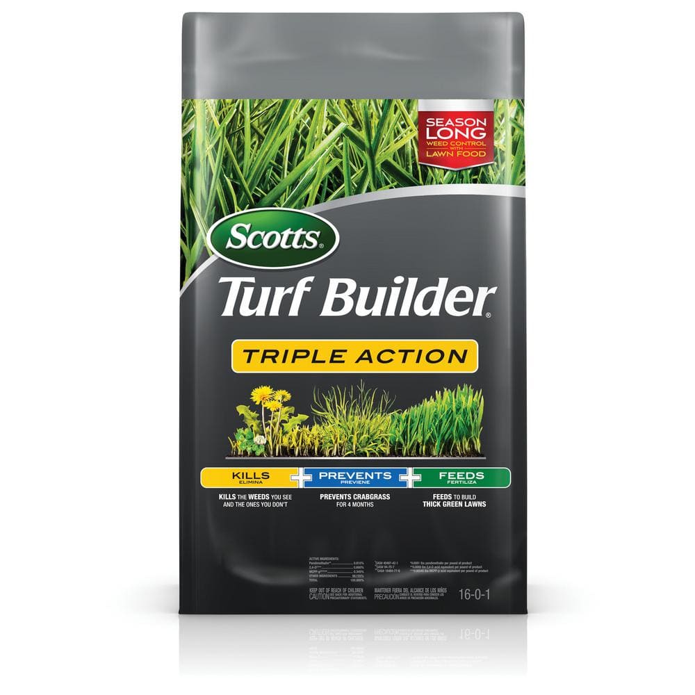 - Scotts Turf Builder Triple Action is a 3-in-1 formula that kills listed weeds, prevents crabgrass, and feeds to build thick, green lawns