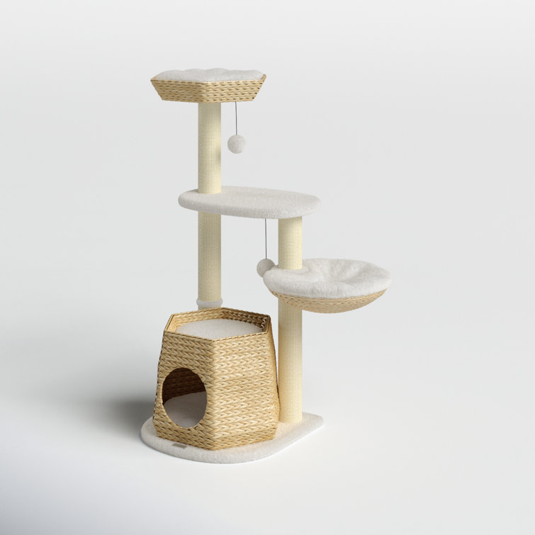 - All-in-one center: This cat activity center gives your cat a space of its own from playtime to sleep time. This tree includes sisal posts, a cattail fluff condo, a hammock, a bed, and hanging balls for exciting play.